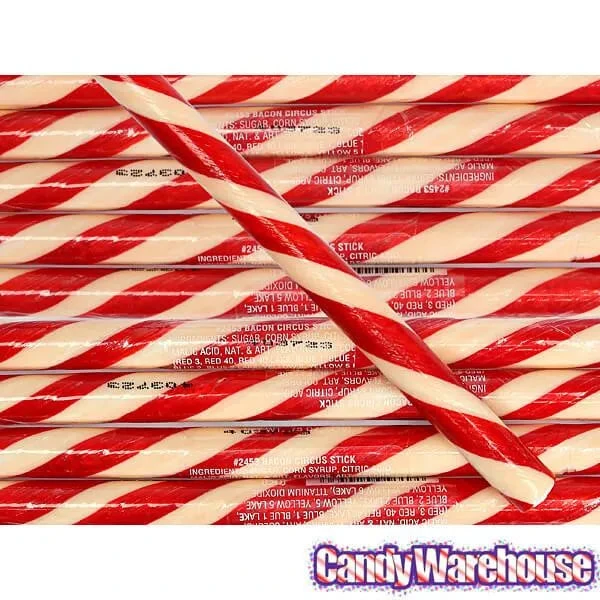 Box contains 100 individually wrapped Bacon Circus Sticks Hard Candy Sticks.