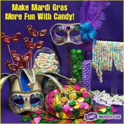 Yummy bubblegum coins wrapped with metallic foils in fun Mardi Gras colors of Purple, Gold, and Green!