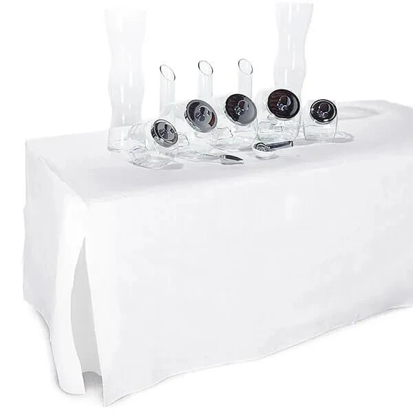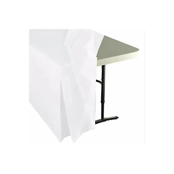 A White Flannel-Backed Vinyl Fitted Table Cover takes your dessert table from drab to fab. This fitted tablecloth is solid white to complement a variety of holiday or themed party decor. Suitable for a standard 6ft folding table, this floor-length tablecloth features clean lines and pleated corners. Use this durable flannel-backed vinyl tablecloth to protect your table from party spills. Perfect for your rectangular table, this reusable white tablecloth is a party essential.