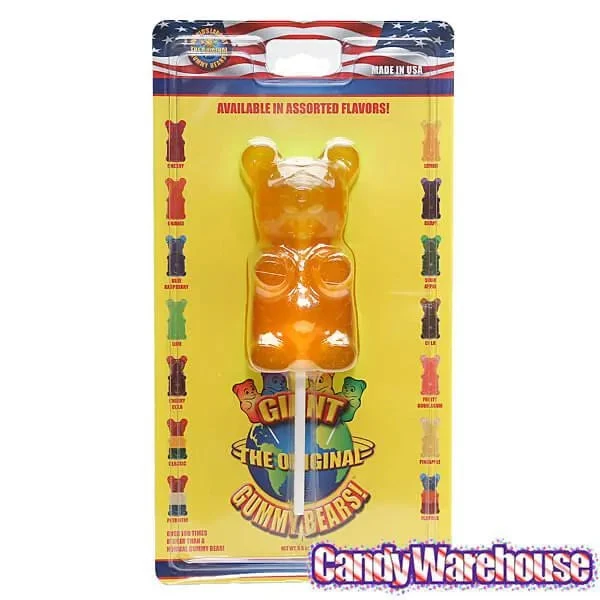 Cute and huggable, this lemon giant gummy bear is mounted on an extra-strong stick for long lasting gummi enjoyment. No more messy fingers while you munch!