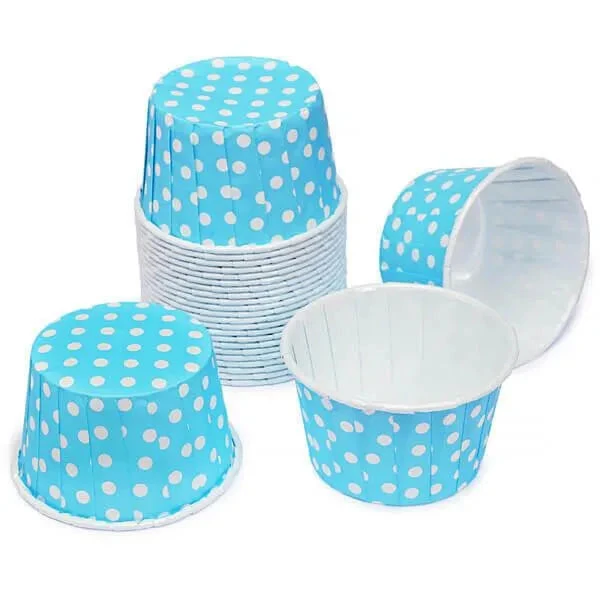 Pack contains 25 Baby Blue Polka Dot Paper Candy Cups, each with a capacity of 4 ounces.