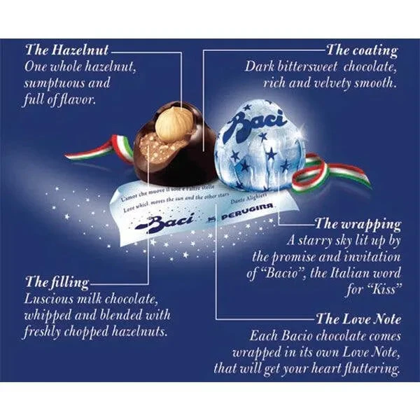 An Italian tradition of passion and style! Foil wrapped pieces of Baci smooth, rich dark chocolate mingled with whole and chopped Hazelnuts.