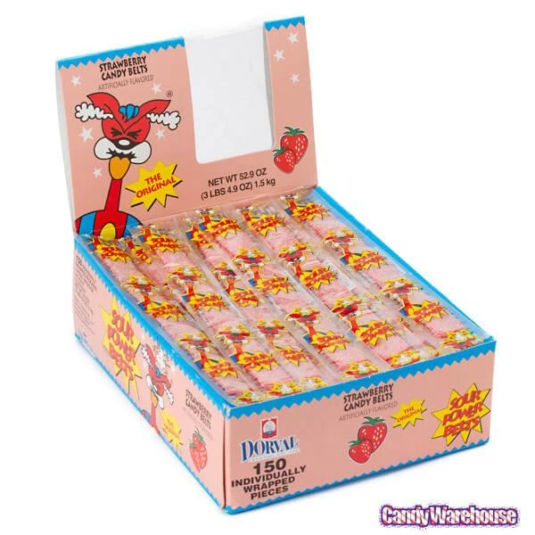 Display box contains 150 wrapped Strawberry Sour Power Candy Belts.