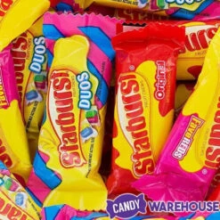 Discover an unexplainably juicy burst of tangy flavor in every handful of Starburst fruit chews fun size packs. This 85 fun size piece bag is chock-full of Starburst Duos, Original, and FaveReds Starburst candies in compact, eminently portable packets of two. Starburst fun size fruit chews are perfect for slipping into pants pockets, car cup holders, and toddler tote bags for effortless indulging on the run. Invite them to your next rainbow-themed birthday party. Their vibrant colors brighten up a candy buffet like nobody’s business. If you’re as crazy as Candy Warehouse is for the chewy goodness of Starburst fruit flavors, check out the distinctively, deliciously different DUOS.