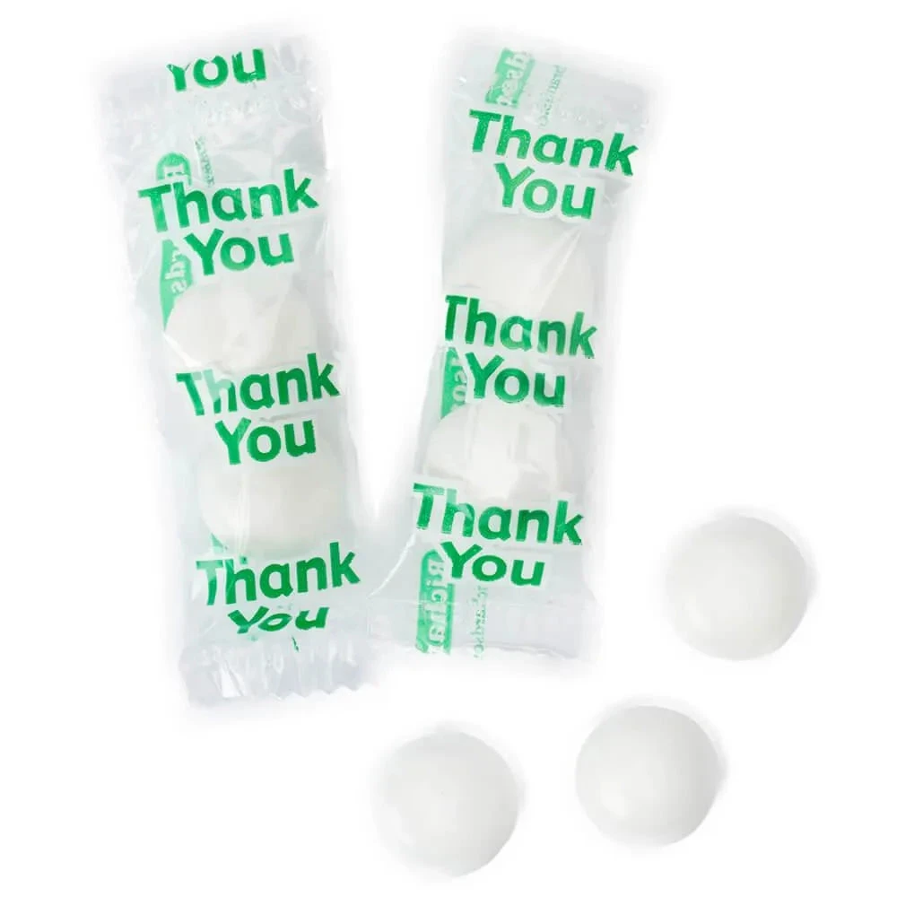 Delicious white candy-coated chocolate mints inside “Thank You” packets!